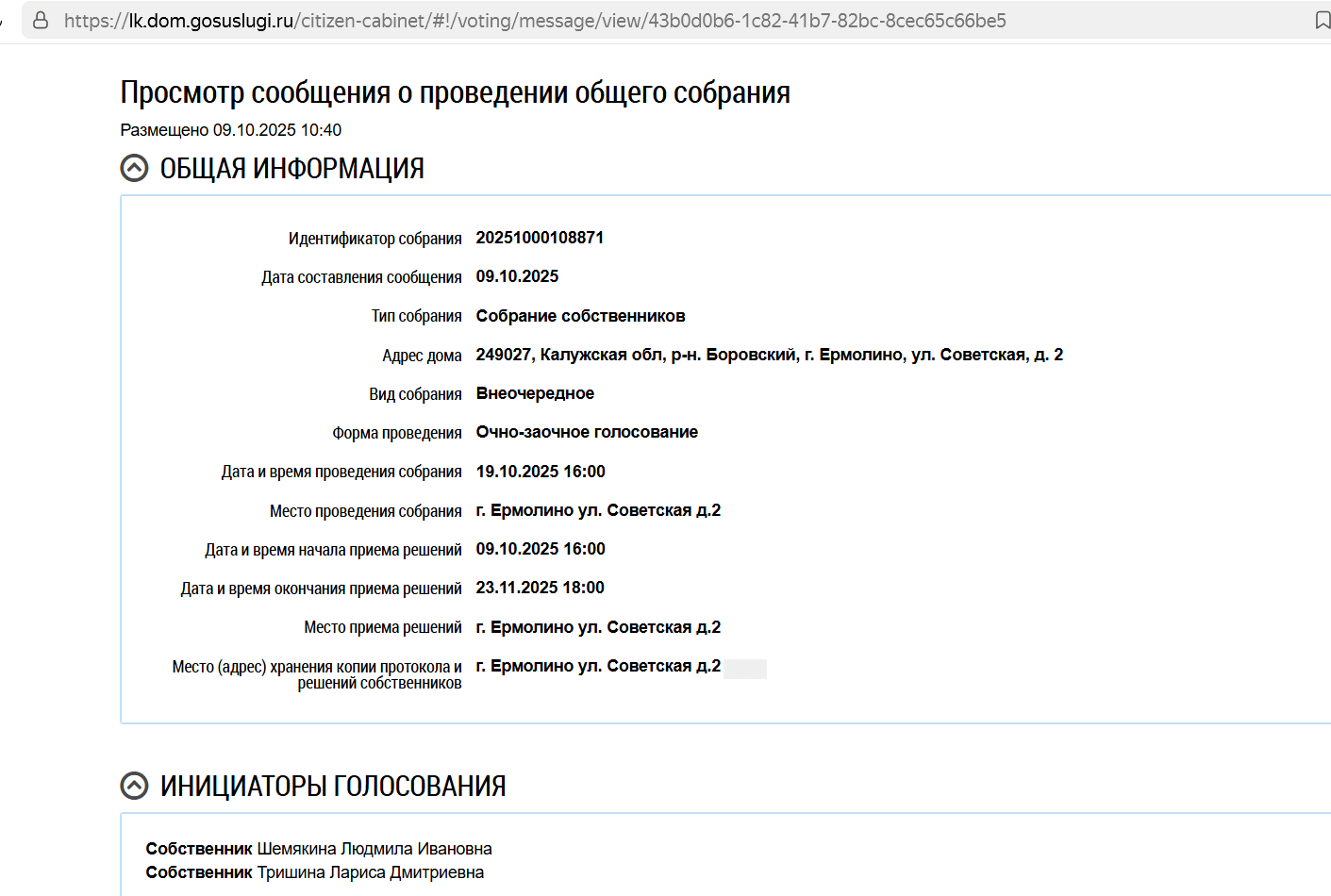 Источник сведений: сообщение о проведении общего собрания №20251000108871, размещённое в ГИС «ЖКХ» 09.10.2025 в 10:40